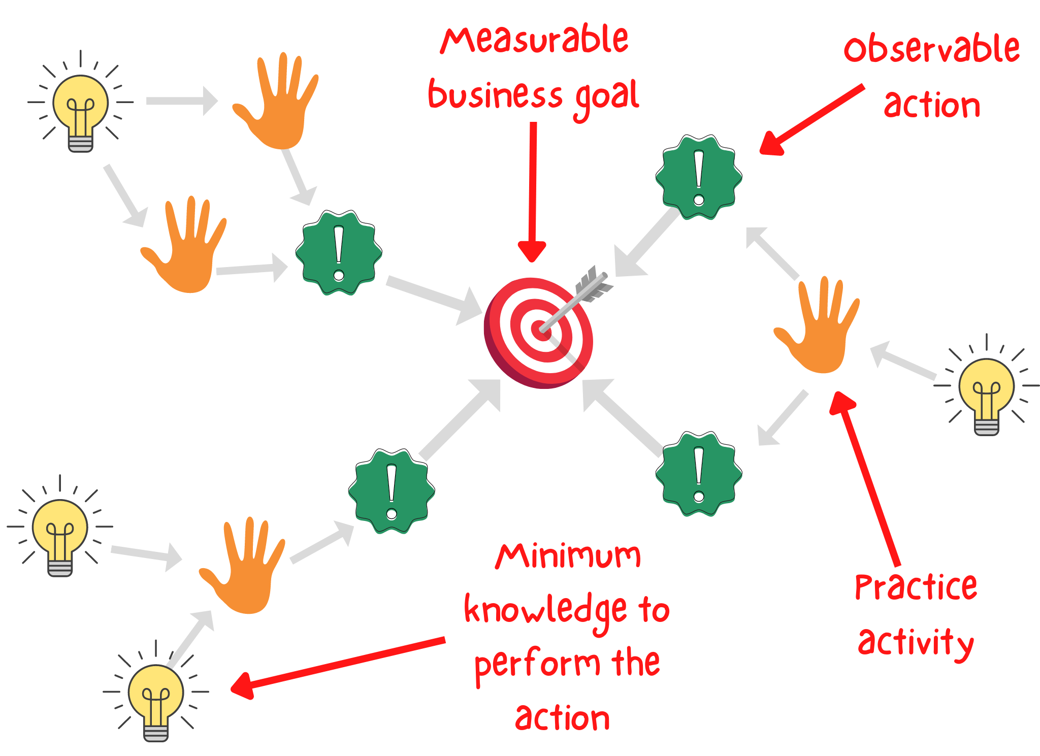Next, list the actions that people must do to meet the business goal. This is often done collaboratively with subject matter experts (SMEs) and/or stakeholders. Only actions that you can observe people doing can be added to this list. Knowledge or understanding cannot be added in this step. Add these actions around the target business goal.