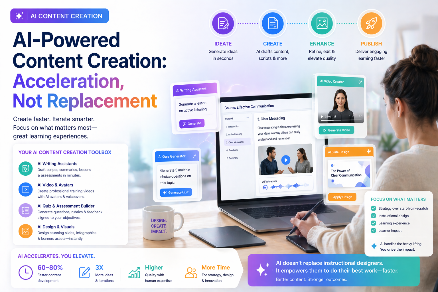 AI-generated content is often discussed as if it will replace instructional designers. In reality, its greatest impact is in accelerating the development process.