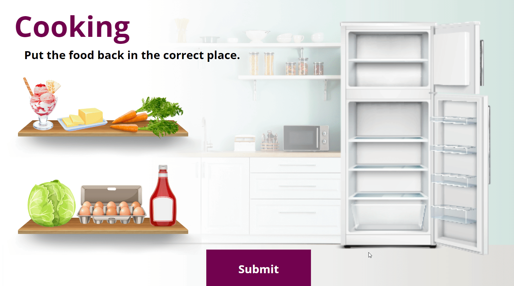 Another learning objective was to help new cooks organize ingredients correctly. Learners must drag food items into the right locations inside a refrigerator. This reinforces food safety and proper storage.