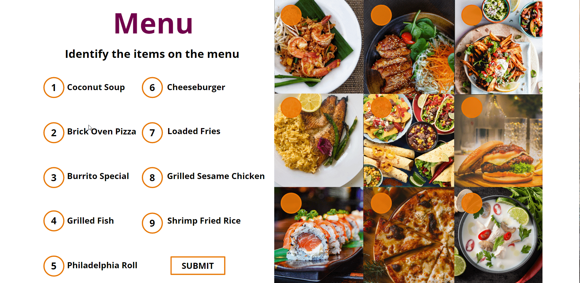 Finally, the learner is introduced to the menu items through an interaction where they match menu item names to images. This is designed to help them recall and associate items quickly during service.