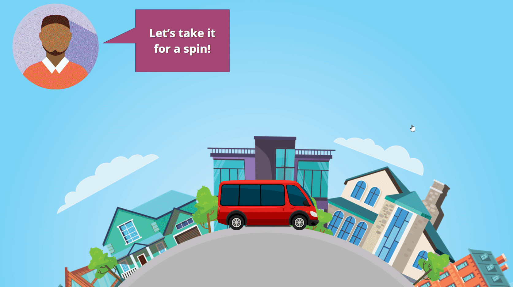 The experience begins with an introductory video to grab the learner’s attention. The learner selects an avatar to personalize their training experience. Next, an animation plays, inviting the learner to enter a van that guides them through the three key training concepts.