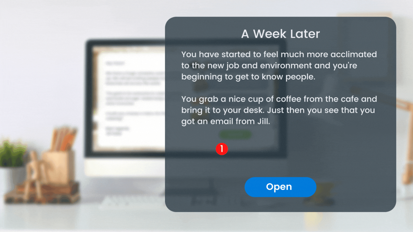 From there, I layered in relatable dialogue, photo-based characters, voiceovers, and feedback to create a realistic, engaging environment that mirrored the workplace.